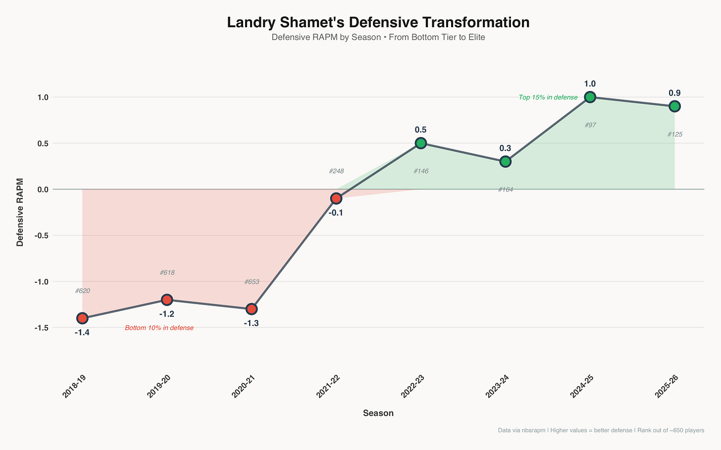 • Bad pass-to-turnover rate: 19.7% (4th percentile) → 13.1% (53rd percentile)