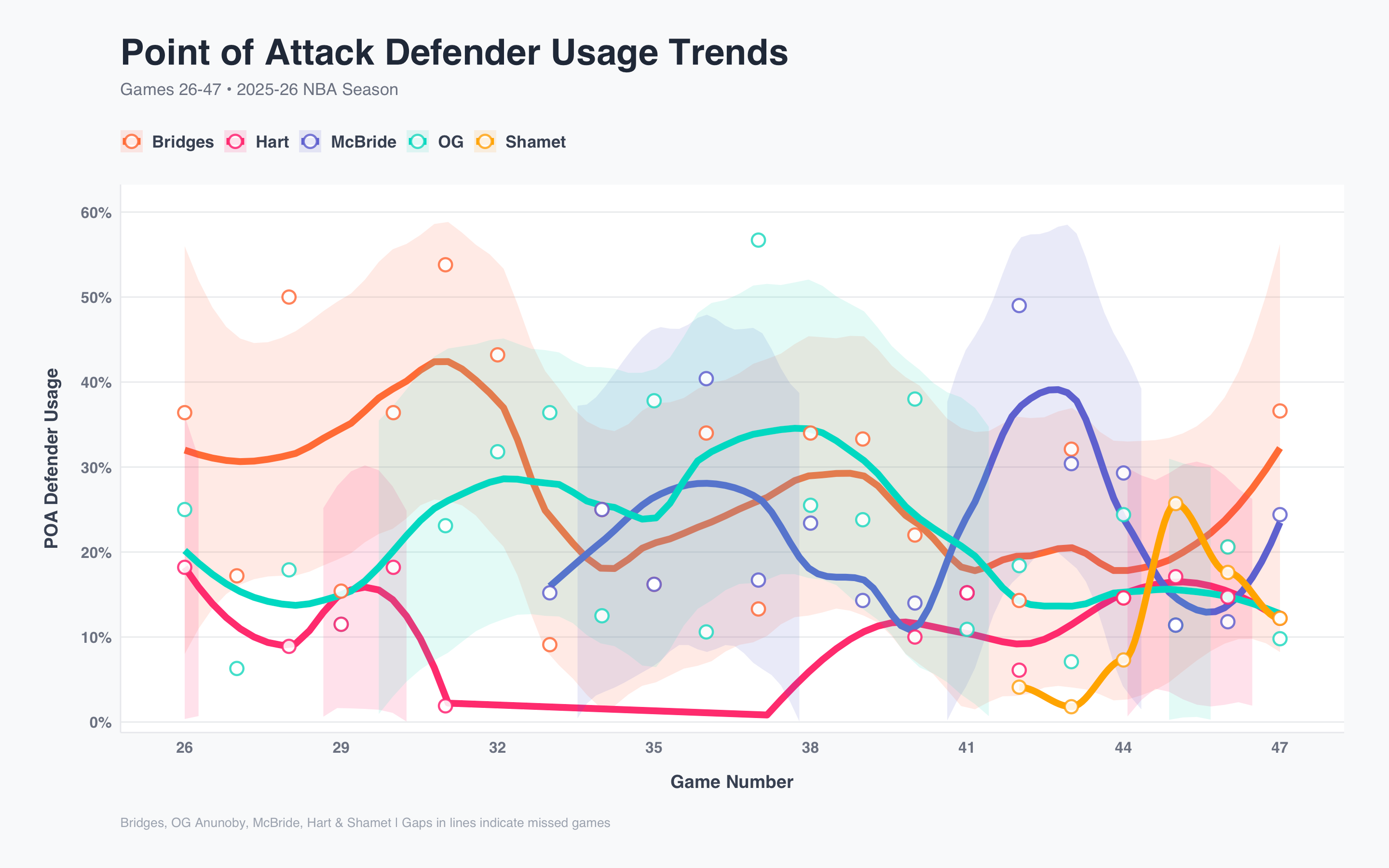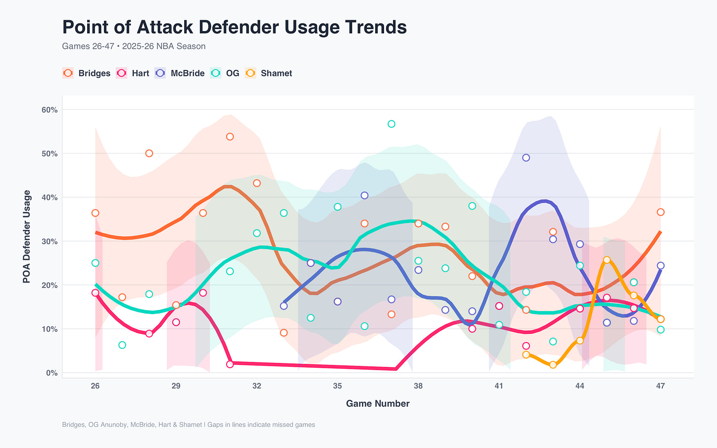 Health matters in the NBA, and that hasn’t consistently been the case for the Knicks until recently. During the December–January stretch, Bridges was forced to shoulder much of the burden as the team’s primary point-of-attack defender, with McBride, Hart, and Shamet all missing time, sometimes simultaneously. That stretch, particularly games 26 through 34, reflects a heavy load on Bridges, shown by the large concentration of orange. It’s worth noting Mike Brown’s own comments on McBride and Shamet, whom he’s described as invaluable defenders for this group. Based on both the film and the data, it’s difficult to argue otherwise.