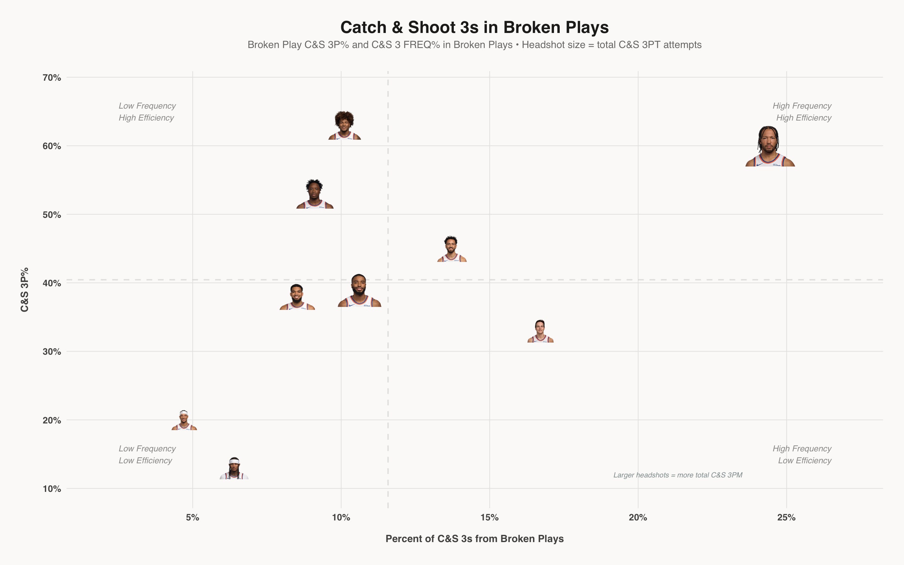 It’s no surprise that 51% of broken plays result in shots at the rim, driven largely by putbacks. That alone explains part of the efficiency. But it’s not the whole story. Broken plays also generate open three-point opportunities, particularly catch-and-shoot looks. For the Knicks, pull-up threes account for just 2.9% of broken-play attempts, compared to roughly 10% in their normal half-court offense. The distinction matters: these possessions shift shot quality from self-created attempts to assisted looks, further boosting efficiency.