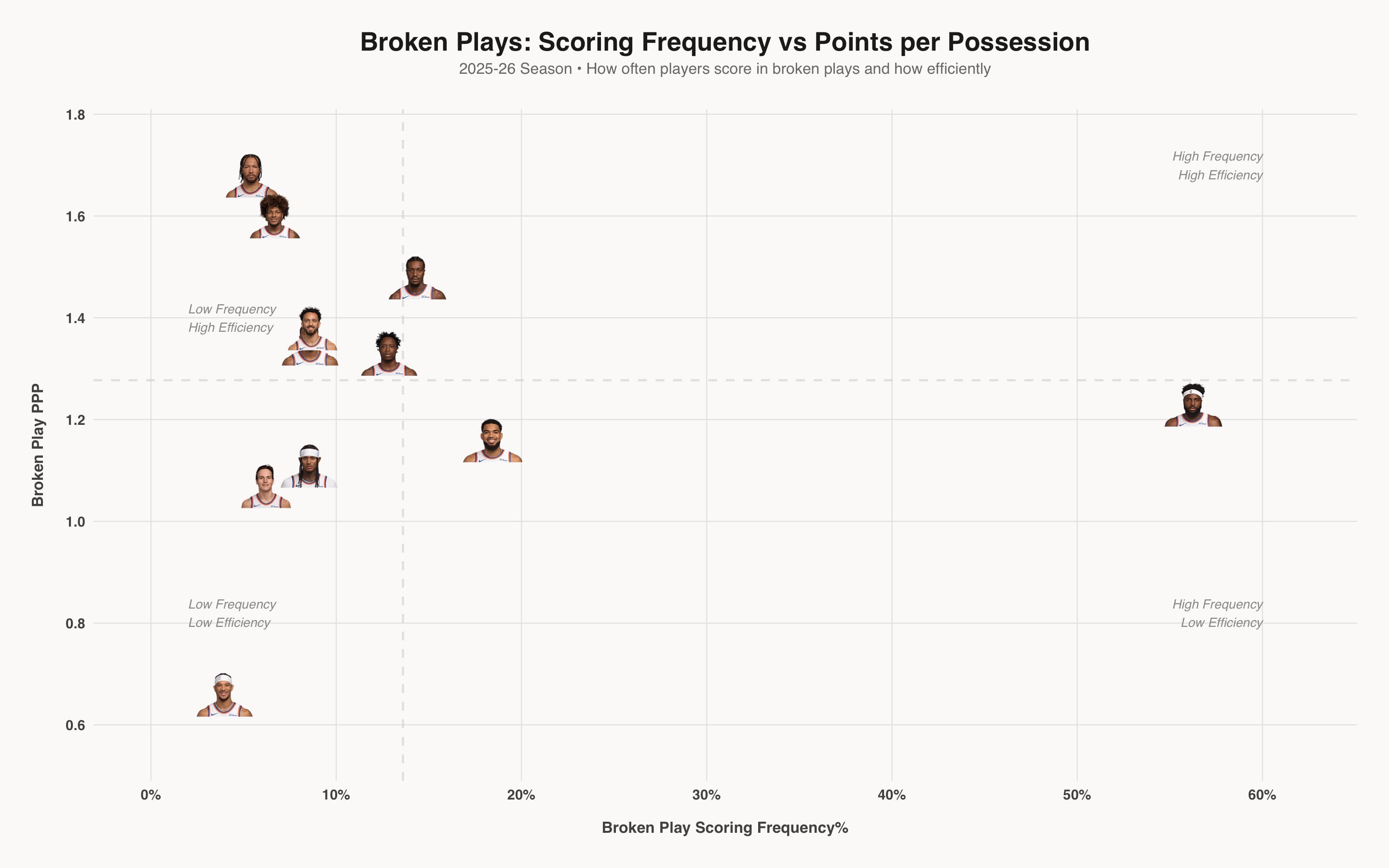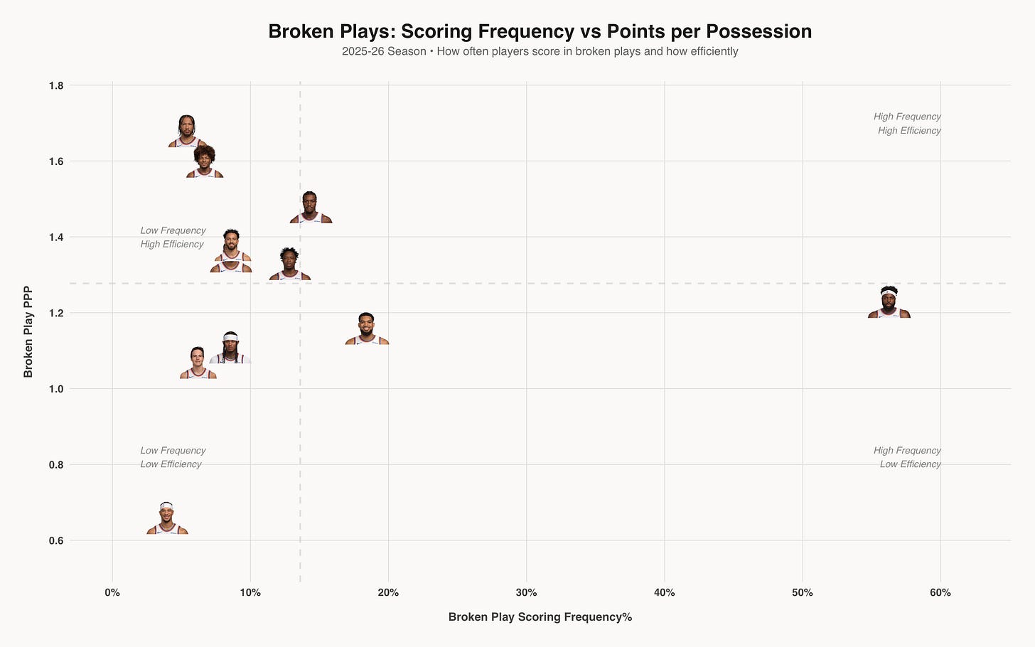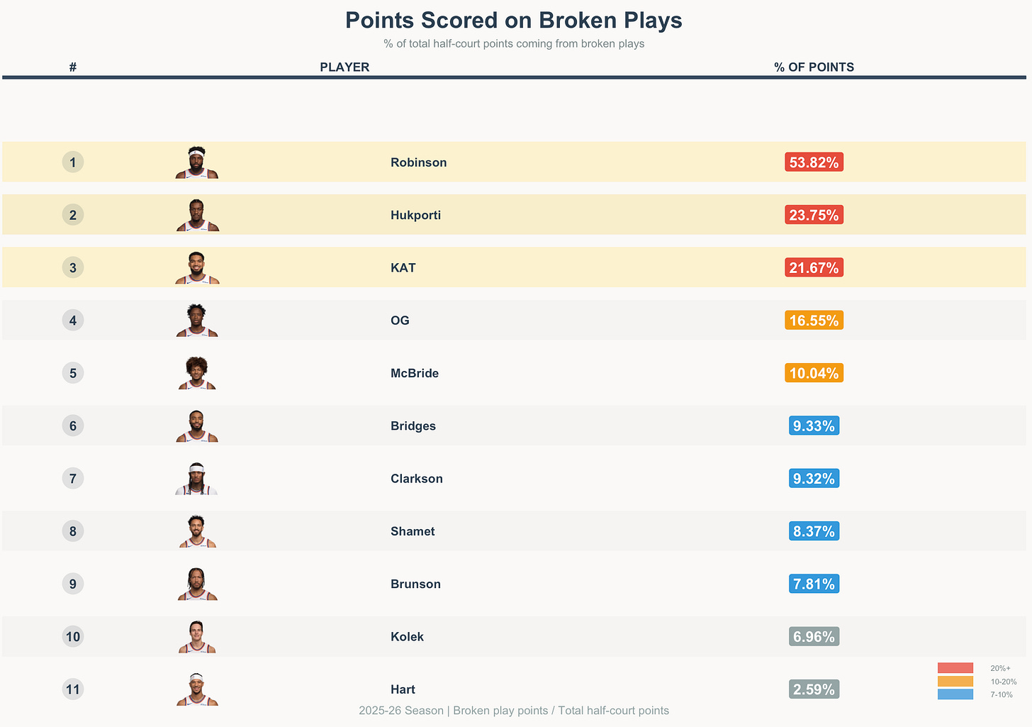 Right away, Mitchell Robinson’s scoring frequency jumps off the page. 56% of his half-court scoring comes on broken plays, a figure that completely dwarfs the rest of the roster. The next closest player is Karl-Anthony Towns, who sits at roughly 18%. Both numbers align with each player’s offensive role, but they raise an important question: are these possessions actually dominant?