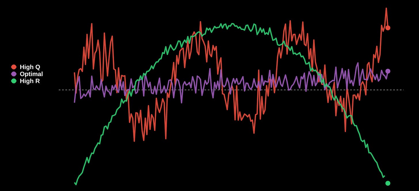 High Q (red line): When the brain over-prioritizes accuracy, you get tense movements. The shooter is making constant micro-adjustments, trying to control every millisecond of the motion. This is the player who looks stiff at the line, overthinking every detail. The result? More variability, because all those corrections introduce noise. Markelle Fultz had a herky-jerky free throw form early in his career.