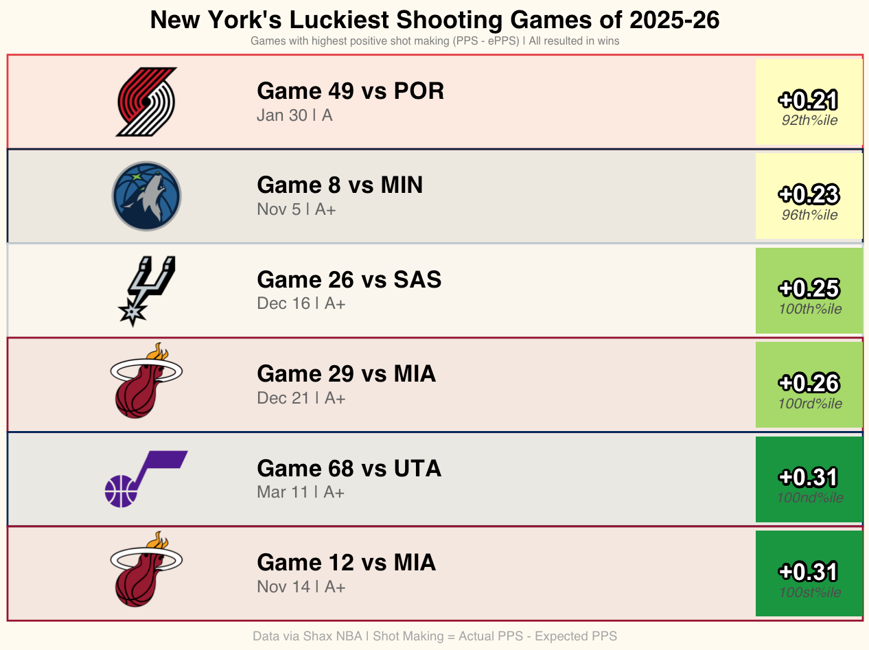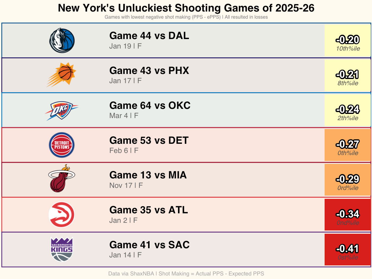 The same context applies. You can be unlucky while also taking poor shots. The Oklahoma City game for example, the Knicks had a 1.25 ePPS, but only posted 1.10 PPS, ultimately having bad luck while shooting elite looks. The contest against the Sacramento Kings is one you can laugh at, producing an abysmal 0.86 PPS despite generating 1.17 ePPS (slightly below the season average of 1.18). Detroit and Atlanta both featured 1.10 ePPS, poor shot quality compounded by cold finishing.