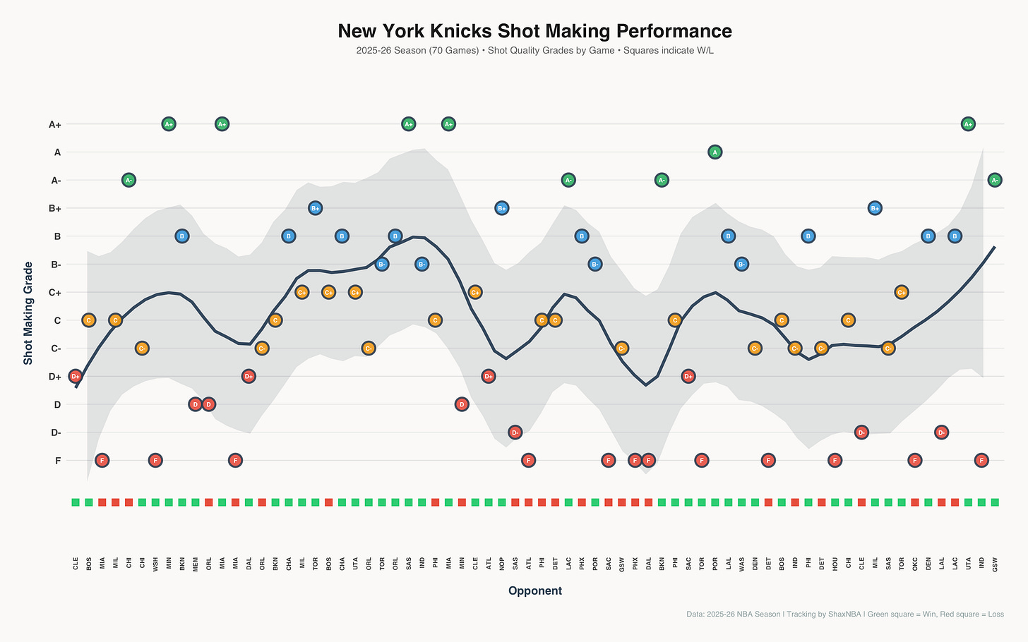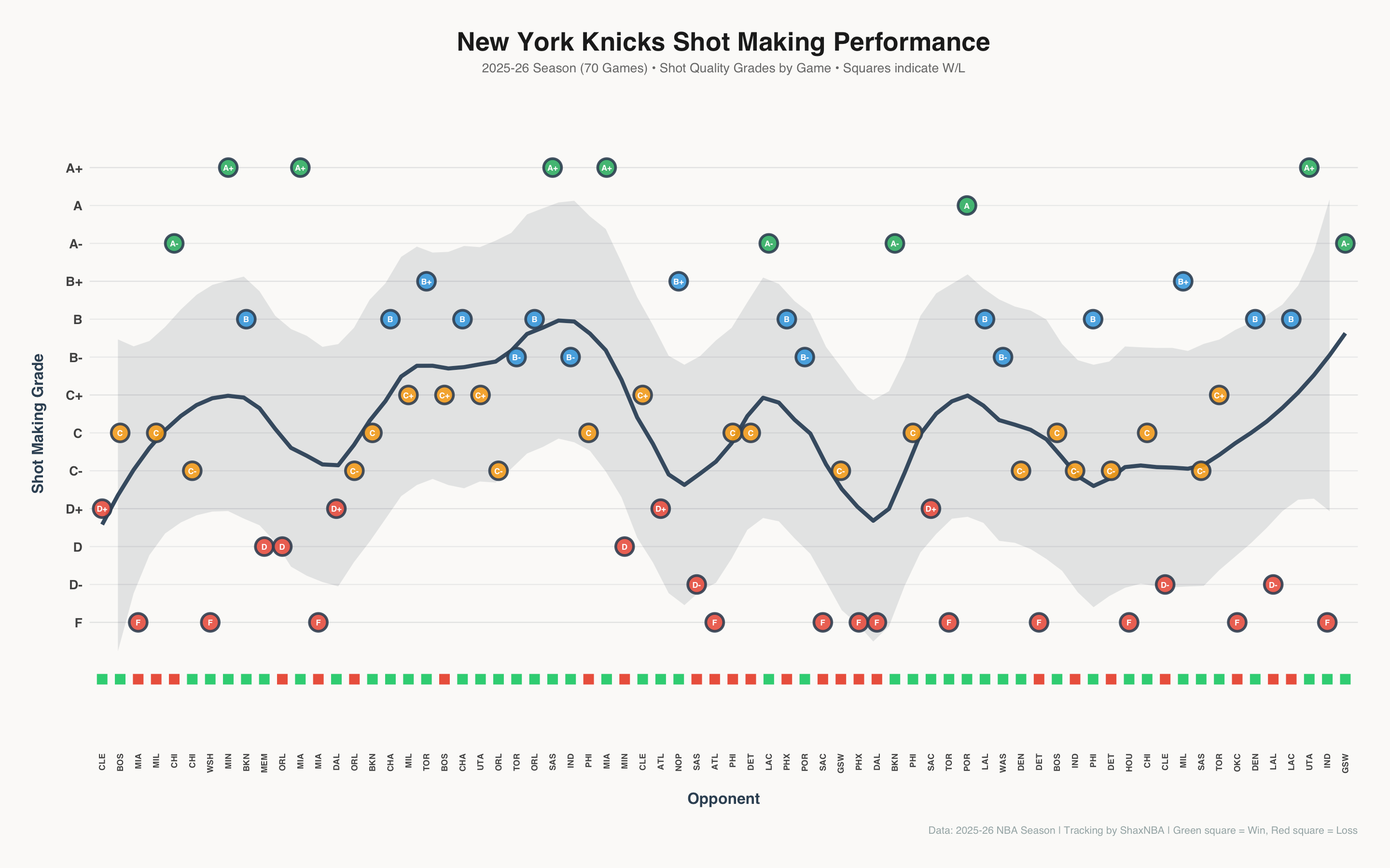 Through 70 games, this chart captures New York’s half-court shot making performance. I define shot making as the difference between actual points per shot (PPS) and expected points per shot (ePPS), where the expected value is calculated based on shot quality variables, shot type, play type, whether the shot was self-created or assisted, and location. To create game-by-game grades, I compare each game’s shot making value to the season average, making the metric team-specific rather than league-relative. Here’s an example of the math using the most recent game against Golden State: